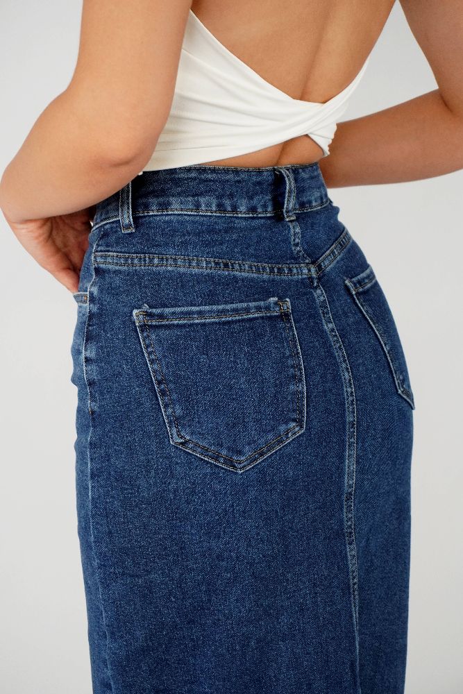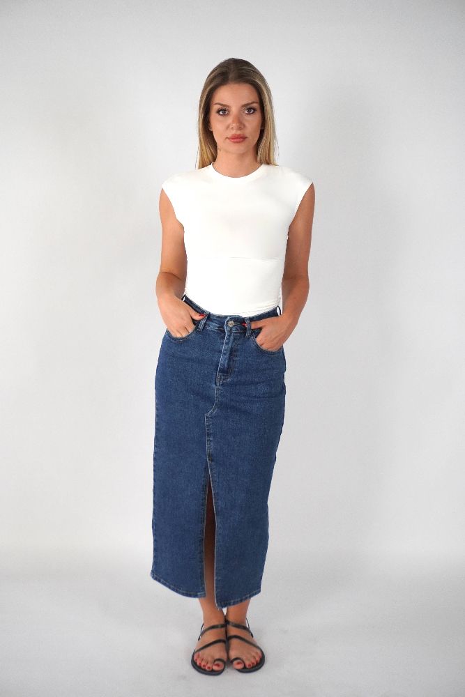 Η Denim Split Skirt είναι η midi φούστα που ισορροπεί τέλεια ανάμεσα στο casual και το statement. Με ψηλή μέση, στενή γραμμή και σκίσιμο μπροστά, δίνει σχήμα στη σιλουέτα και αφήνει ελευθερία στην κίνηση. Το βαθύ μπλε denim της την κάνει ιδανική για day-to-night συνδυασμούς.