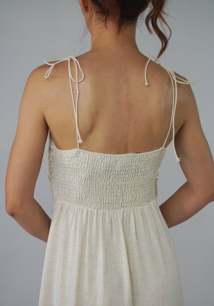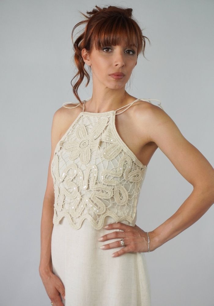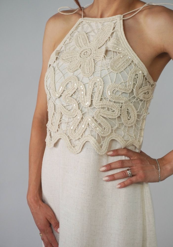 Το Isla dress είναι ένα αέρινο μάξι φόρεμα με boho διάθεση και ρομαντική αύρα. Το κεντητό crochet μπούστο με παγιέτες συνδυάζεται ιδανικά με το λινό ύφασμα, δημιουργώντας μια κομψή και φυσική εμφάνιση. Δένει στους ώμους για ευέλικτη εφαρμογή και προσφέρει στιλ και άνεση για κάθε καλοκαιρινή περίσταση.