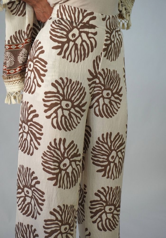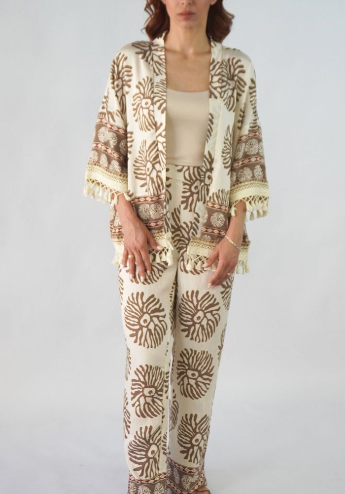 Το Kaya Set συνδυάζει την άνεση με την ethnic κομψότητα. Ένα δίχρωμο σετ που αποπνέει χαρακτήρα, με ανάλαφρο ύφασμα και tribal print που κλέβει τις εντυπώσεις. Το κιμονό έχει φαρδιά γραμμή και κρόσσια στο τελείωμα για μια μποέμ πινελιά, ενώ το παντελόνι εφαρμόζει άνετα χάρη στο λάστιχο στη μέση. Φοριέται μαζί ή ξεχωριστά, από το πρωί έως το βράδυ.