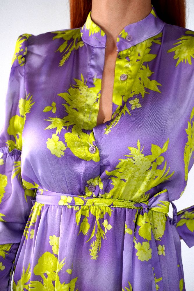 To Vina dress σε ταξιδεύει στη ρετρό πολυτέλεια των 70s, με ένα ultra-modern twist. Το μοτίβο με lime λουλούδια πάνω στο μεταξωτό μωβ φόντο δεν περνά απαρατήρητο, ενώ η άνετη γραμμή, τα balloon μανίκια και ο γιακάς με κουμπάκια προσθέτουν fashion credibility. Η ζώνη τονίζει τη μέση για σιλουέτα με σχήμα.