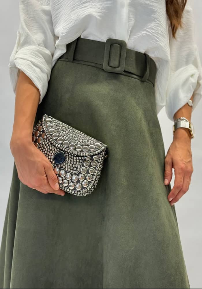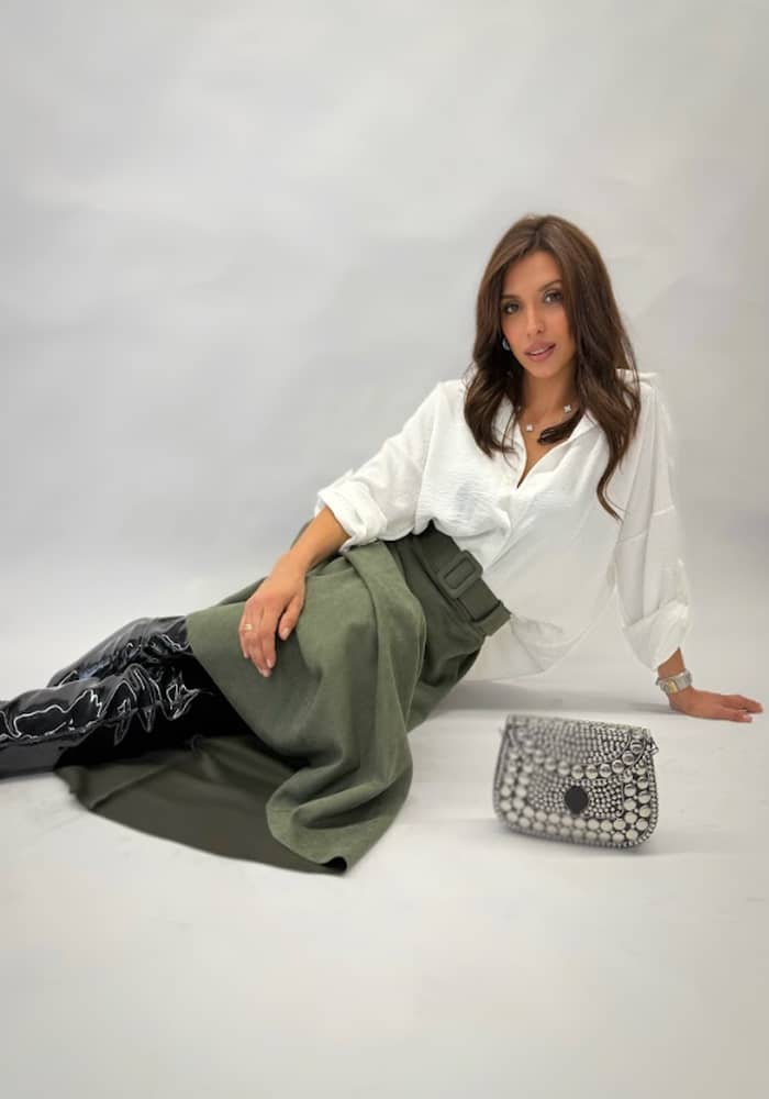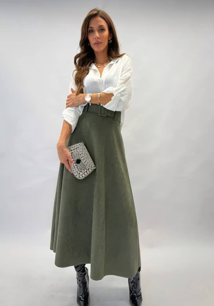 Midi φούστα σε βαθύ χακί χρώμα, με μαλακή υφή και ζώνη στη μέση για άψογη εφαρμογή.
