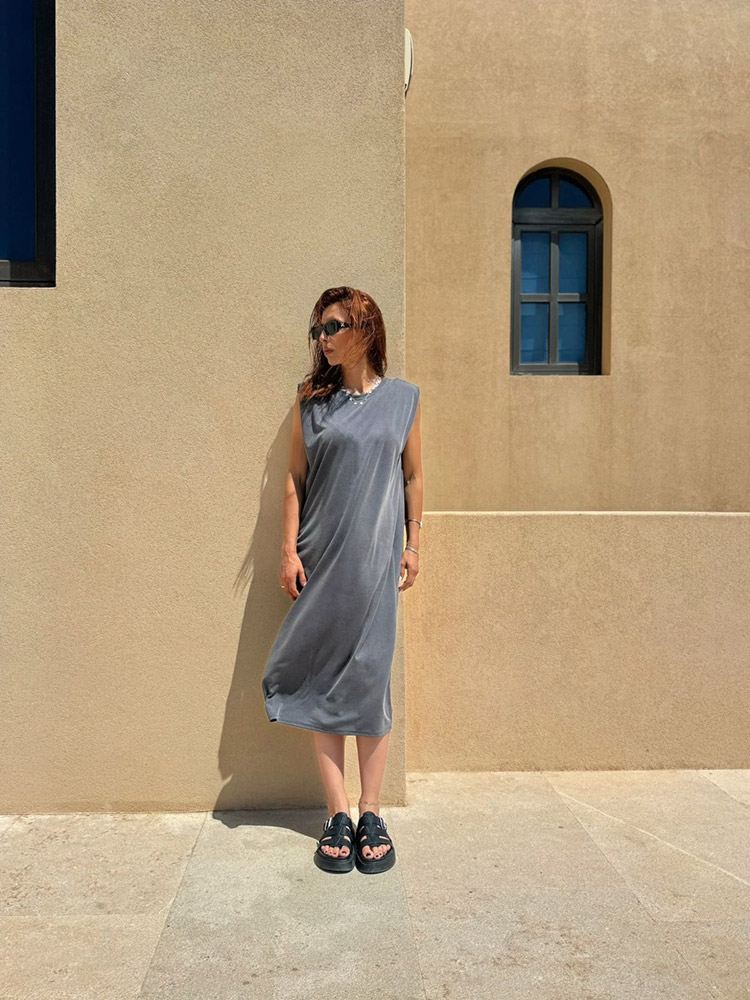 To Urban Ease είναι ανάλαφρο και κομψό, αυτό το midi φόρεμα σε βαθύ γκρι τόνο είναι η απόλυτη επιλογή για τις ζεστές μέρες του καλοκαιριού. Με χαλαρή γραμμή και ελαστικό ύφασμα, προσφέρει άνεση και στυλ σε κάθε βήμα. Συνδυάζεται ιδανικά με chunky σανδάλια για urban chic εμφανίσεις.